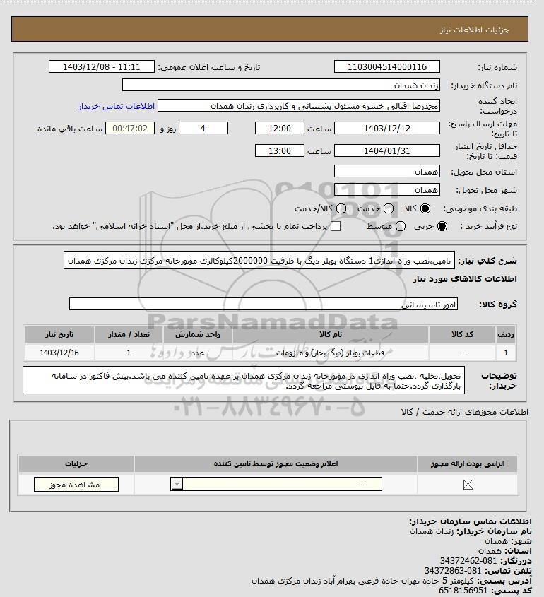 شرح کلی نیاز: تامین،نصب وراه اندازی1 دستگاه بویلر دیگ با ظرفیت 2000000کیلوکالری موتورخانه مرکزی زندان مرکزی همدان