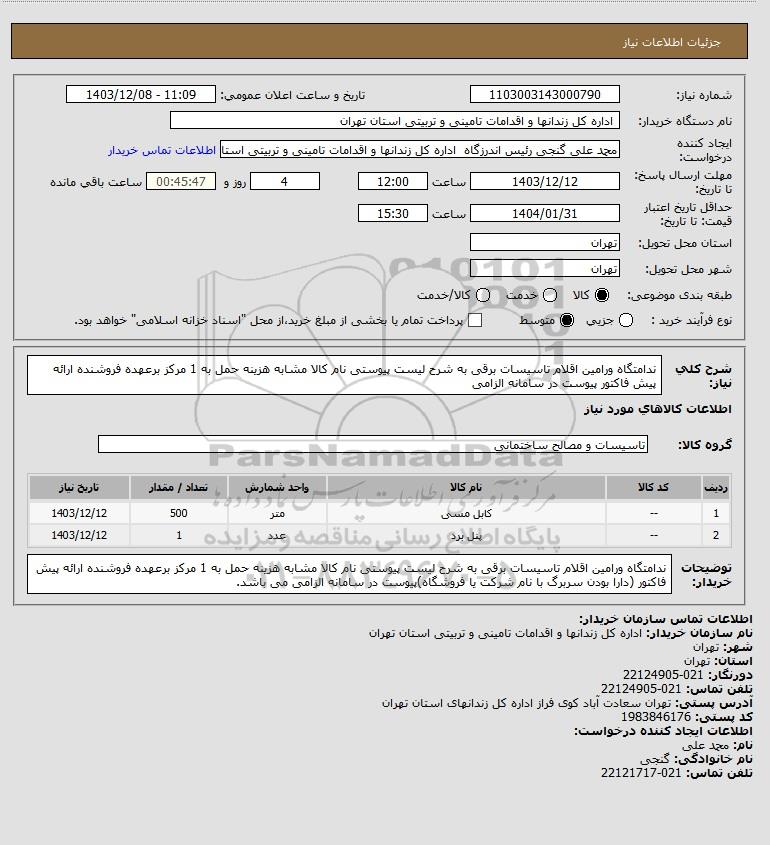 شرح کلی نیاز: ندامتگاه ورامین اقلام تاسیسات برقی به شرح لیست پیوستی نام کالا مشابه هزینه حمل به 1 مرکز برعهده فروشنده ارائه پیش فاکتور پیوست در سامانه الزامی