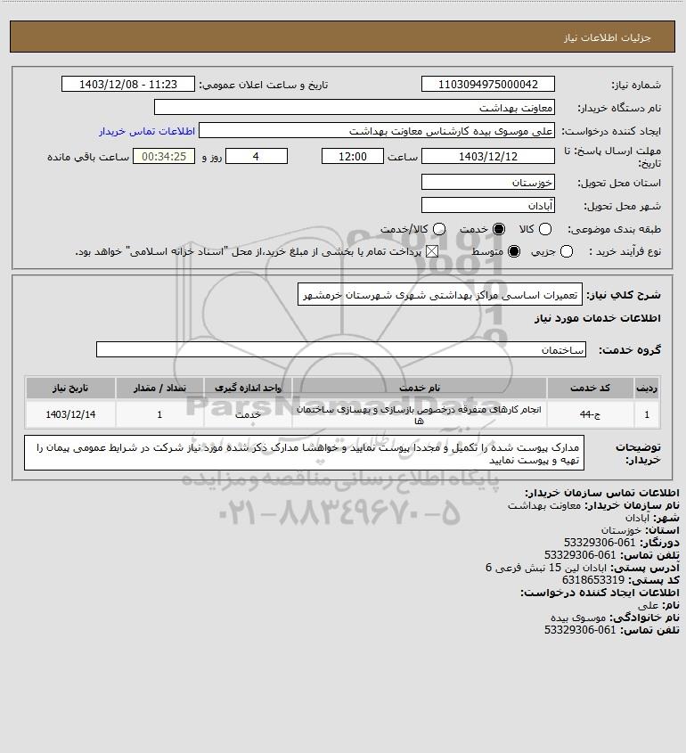 شرح کلی نیاز: تعمیرات اساسی مراکز بهداشتی شهری شهرستان خرمشهر