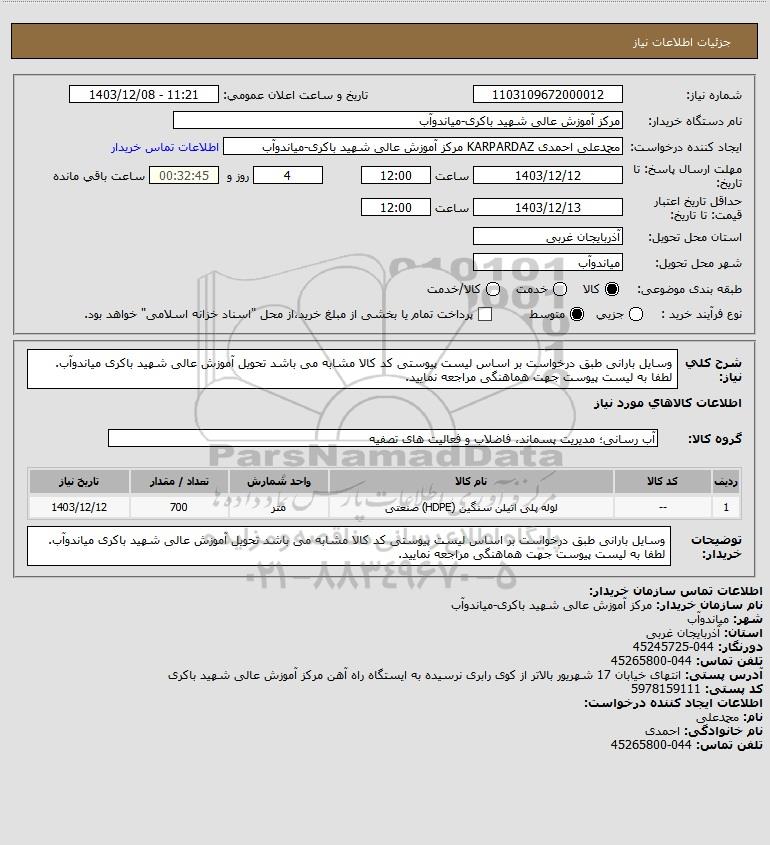 شرح کلی نیاز: وسایل بارانی طبق درخواست بر اساس لیست پیوستی کد کالا مشابه می باشد تحویل آموزش عالی شهید باکری میاندوآب. لطفا به لیست پیوست جهت هماهنگی مراجعه نمایید.