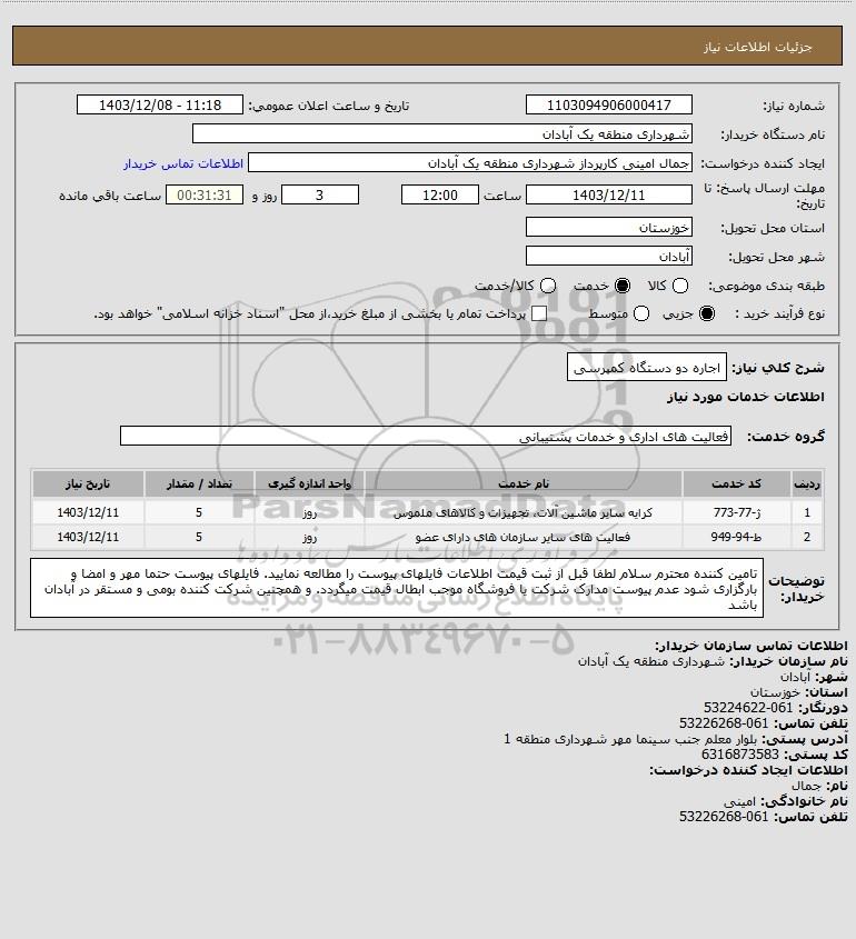 نام دستگاه خریدار:شهرداری منطقه یک آبادان