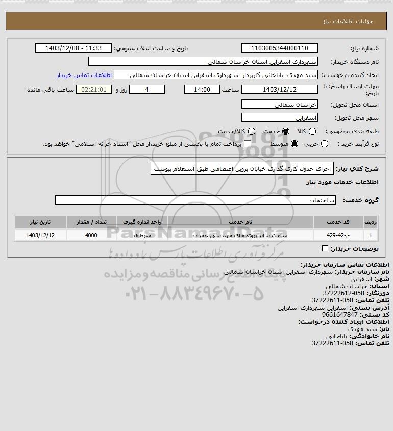 شرح کلی نیاز: اجرای جدول کاری گذاری خیابان پروین اعتصامی طبق استعلام پیوست