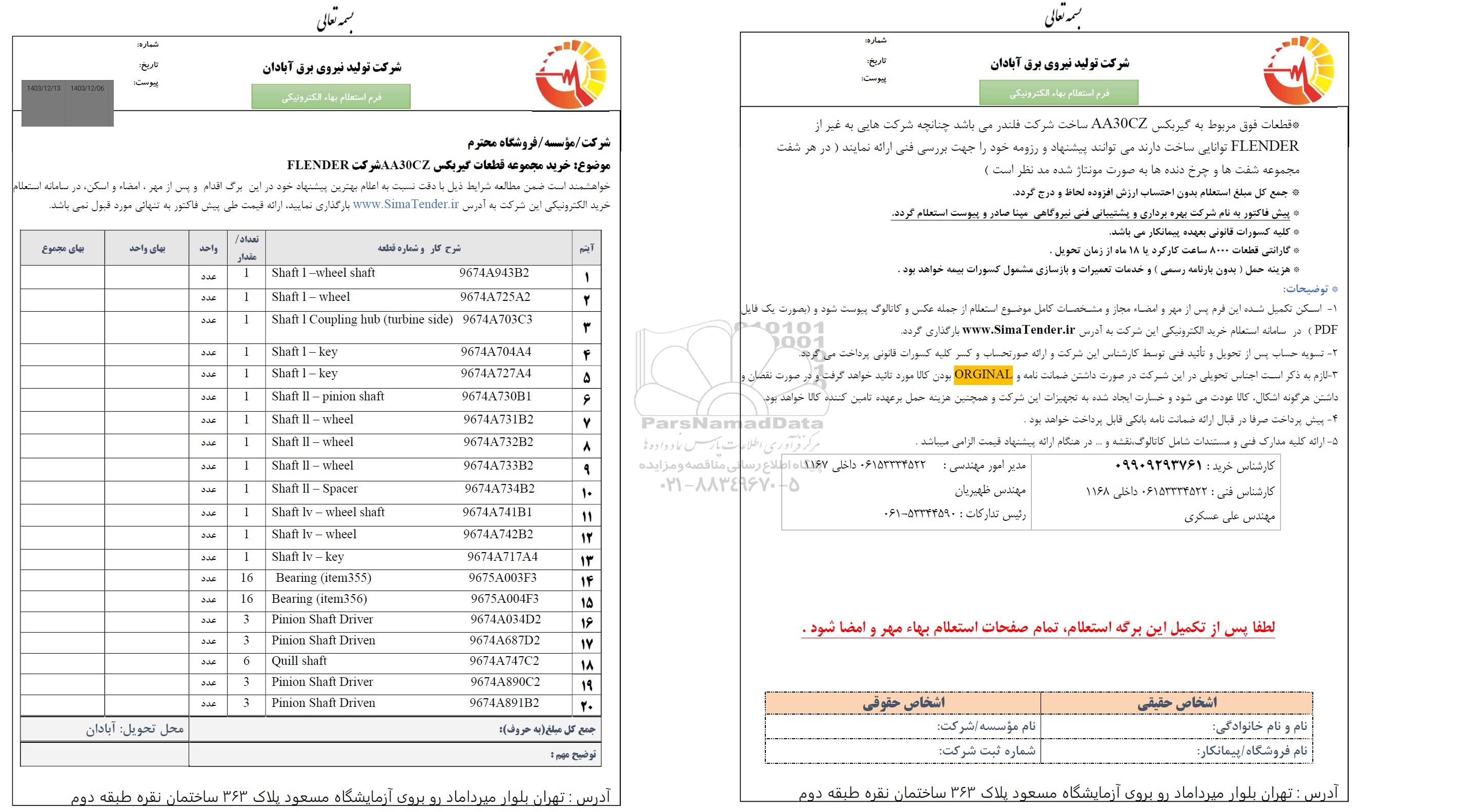 خواهشمند است ضمن مطالعه شرایط ذیل با دقت نسبت به اعلام بهترین پیشنهاد خود در این برگ اقدام و پس از مهر ، امضاء و اسکن در سامانه استعلام خرید الکترونیکی این شرکت به آدرس www.SimaTender.ir بارگذاری نمایید، ارائه قیمت طی پیش فاکتور به تنهایی مورد قبول نمی باشد.
