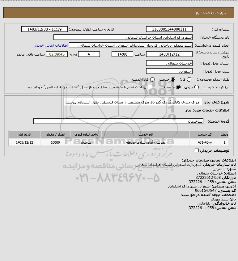 شرح کلی نیاز: اجرای جدول کاری گذاری گذر 16 متری منشعب از میدان فلسطین طبق استعلام پیوست