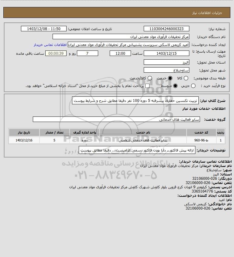 شرح کلی نیاز: تربیت تکنسین حفاری پیشرفته 5 دوره 100 نفر دقیقا مطابق شرح و شرایط پیوست