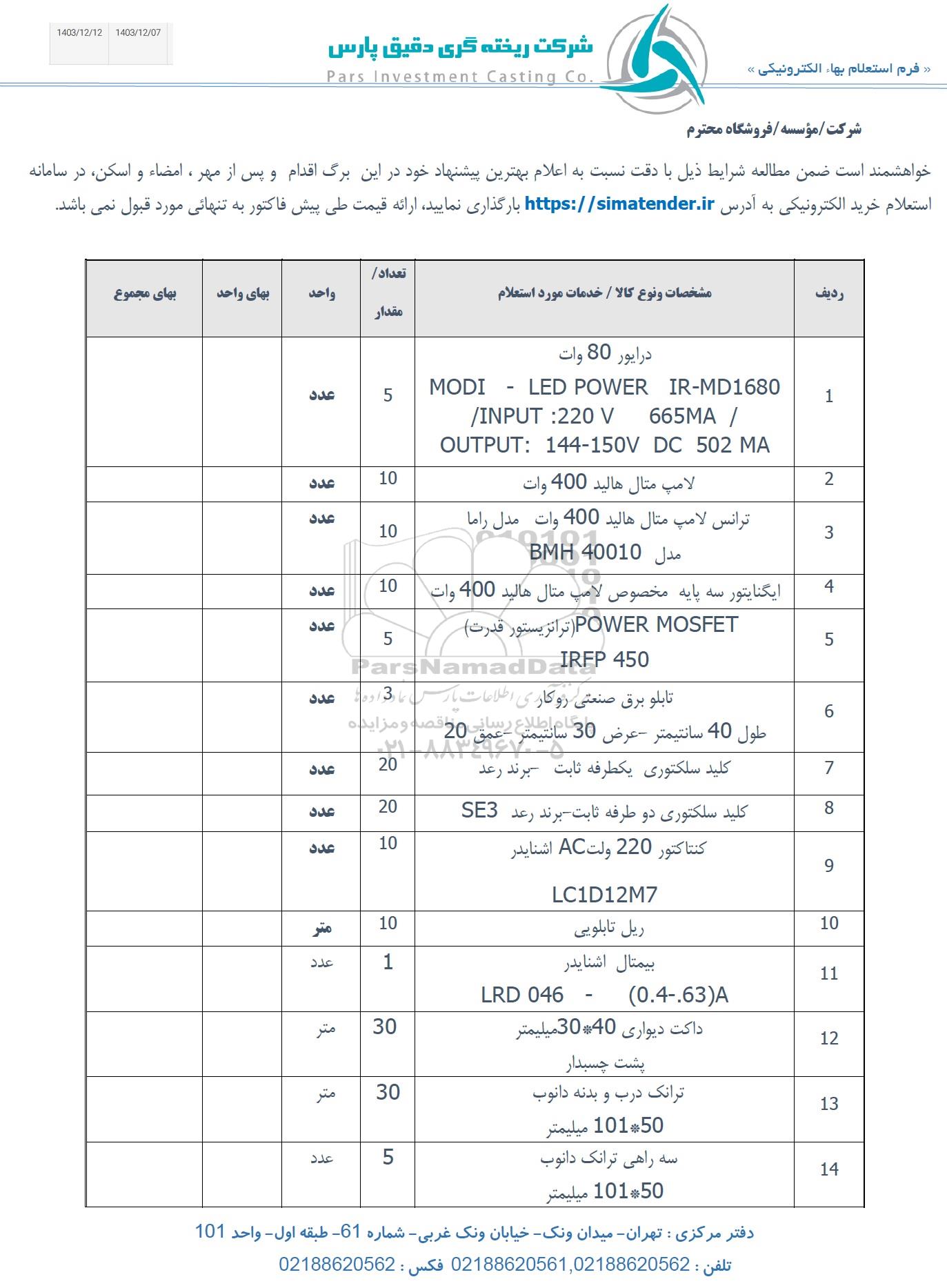 خواهشمند است ضمن مطالعه شرایط ذیل با دقت نسبت به اعلام بهترین پیشنهاد خود در این برگ اقدام و پس از مهر، امضا و اسکن، در سامانه استعلام خرید الکترونیکی به آدرس https://simatender.ir بارگذاری نمایید، ارائه قیمت طی پیش فاکتور به تنهایی مورد قبول نمی باشد.