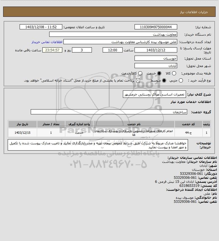 شرح کلی نیاز: تعمیرات اساسی مراکز روستایی خرمشهر
