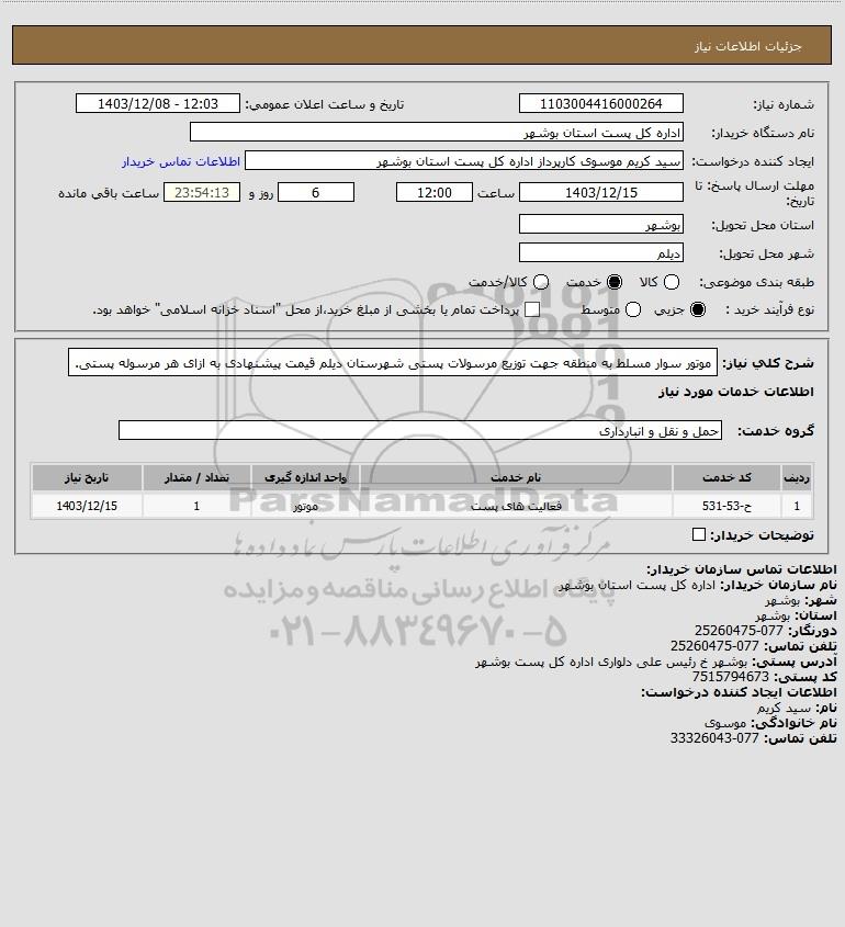 شرح کلی نیاز: موتور سوار مسلط به منطقه جهت توزیع مرسولات پستی شهرستان دیلم قیمت پیشنهادی به ازای هر مرسوله پستی.
