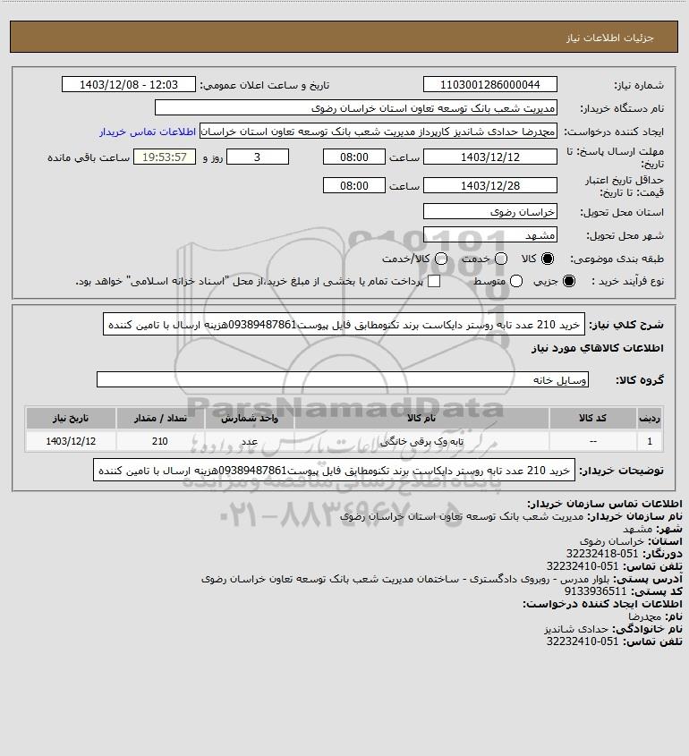نام دستگاه خریدار:مدیریت شعب بانک توسعه تعاون استان خراسان رضوی