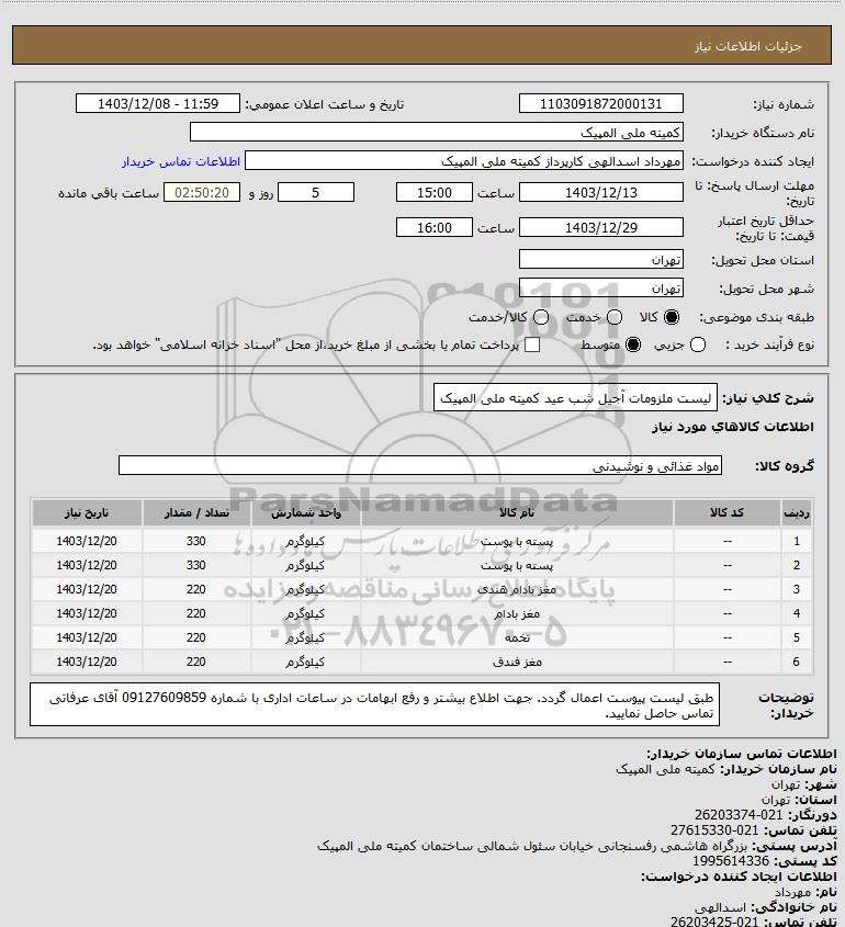 استعلام لیست ملزومات آجیل شب عید کمیته ملی المپیک, استعلام لیست ملزومات آجیل شب عید کمیته ملی المپیک