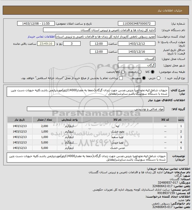 | 5 | -- | عدس خشک | کیلوگرم | 5,000 | 1403/12/13 |