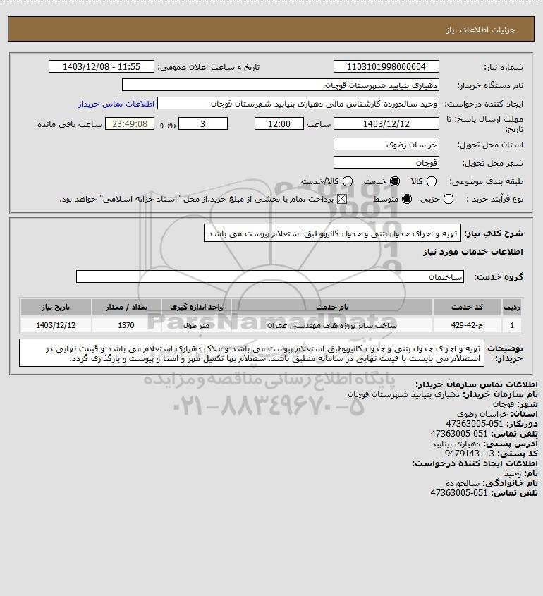 توضیحات خریدار:تهیه و اجرای جدول بتنی و جدول کانیووطبق استعلام پیوست می باشد و ملاک دهیاری استعلام می باشد و قیمت نهایی در استعلام می بایست با قیمت نهایی در سامانه منطبق باشد.استعلام بها تکمیل مهر و امضا و پیوست و بارگذاری گردد.