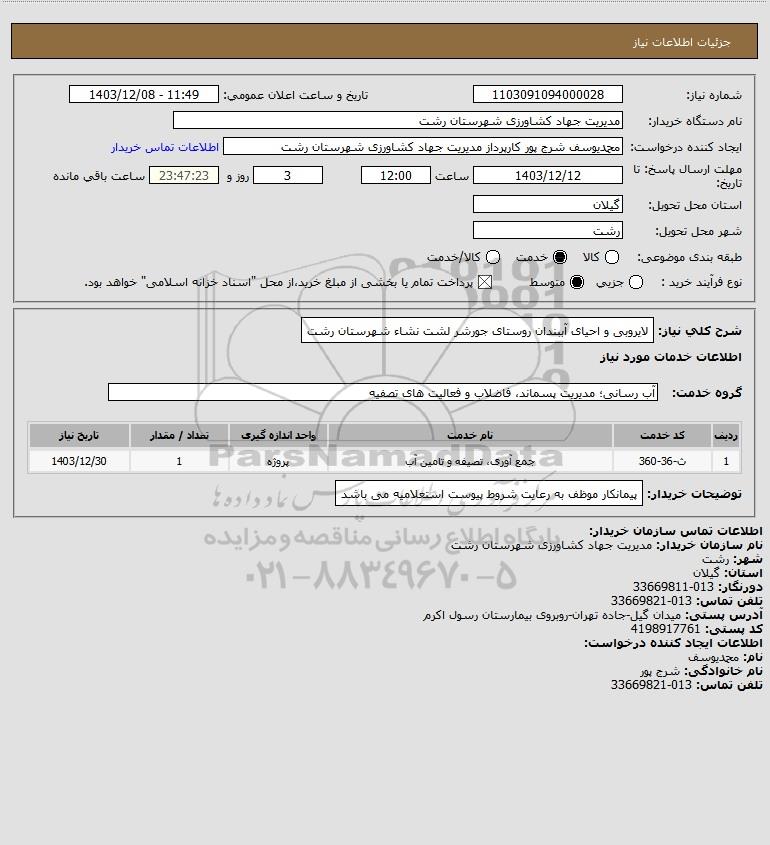 شرح کلی نیاز: لایروبی و احیای آببندان روستای جورشر لشت نشاء شهرستان رشت