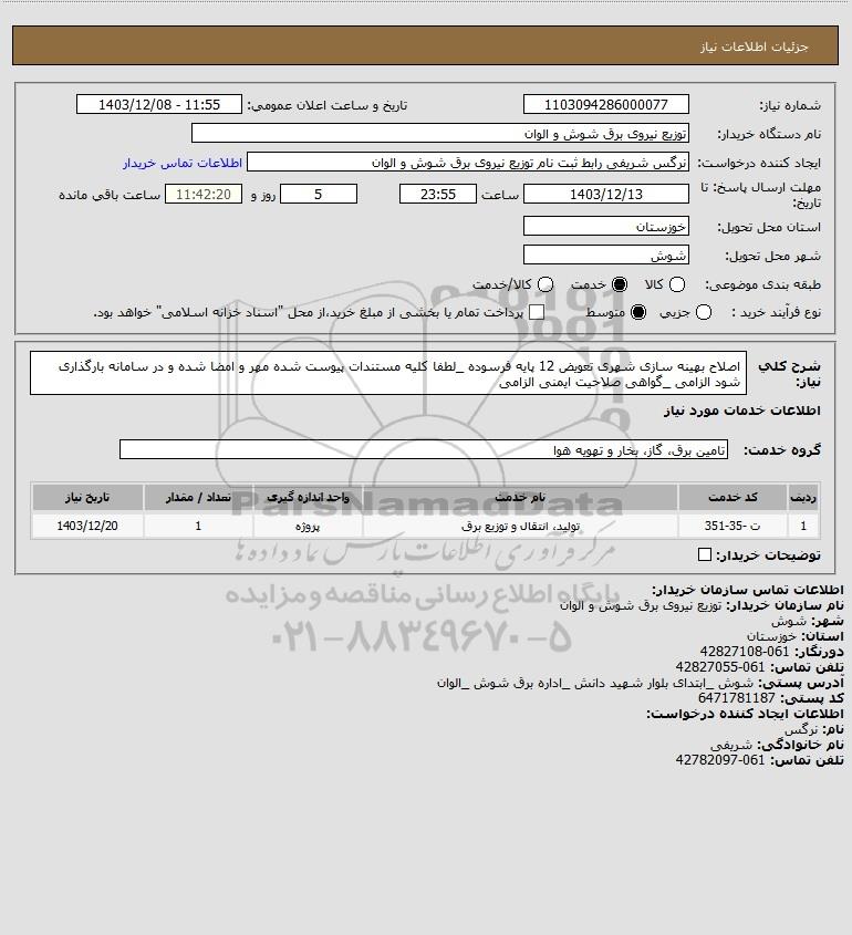 شرح کلی نیاز: اصلاح بهینه سازی شهری تعویض 12 پایه فرسوده _لطفا کلیه مستندات پیوست شده مهر و امضا شده و در سامانه بارگذاری شود الزامی _گواهی صلاحیت ایمنی الزامی