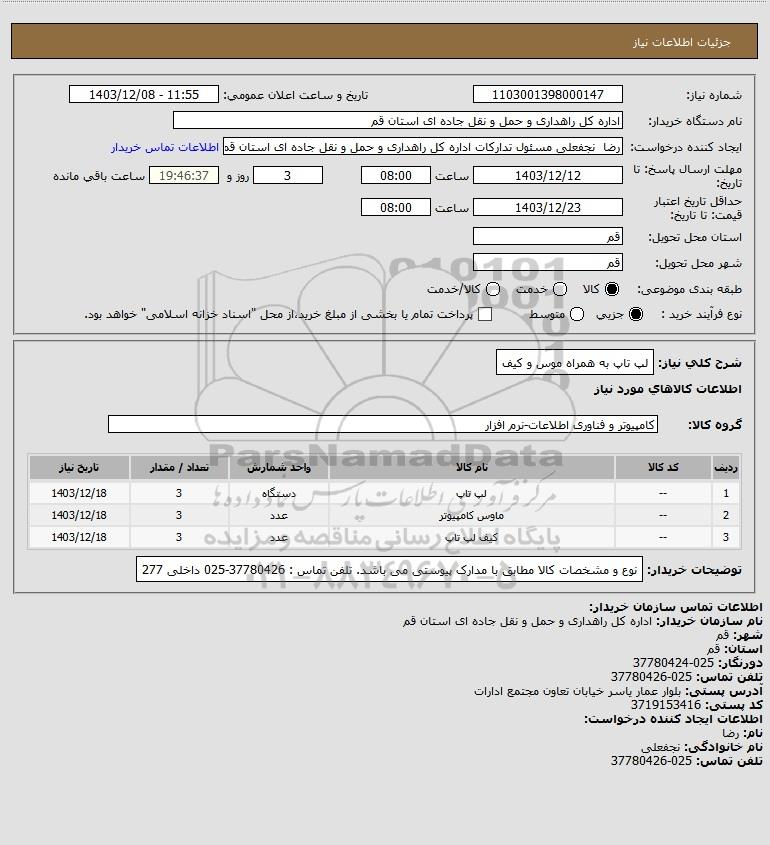 استعلام بها و موضوع استعلام استعلام لپ تاپ به همراه موس و کیف به اطلاع کلیه شرکتها و افراد متخصص واجد شرایط میرساند، آگهی گذار در نظر دارد از طریق استعلام بها، نسبت به انتخاب و دریافت پیشنهادات اقدام نماید. این استعلام با کد آگهی ثبت شده در سامانه خبرگزاری پارس نماد : 8733671 منتشر شده است. مشخصات استعلام : تاریخ شروع استعلام: 1403/12/08 آخرین مهلت ارسال پیشنهاد قیمت : 1403/12/12 و محل اجرای پروژه : استان قم میباشد. استعلام قیمت مورد درخواست : استعلام لپ تاپ به همراه موس و کیف با دستهبندیهای تخصصی و گروه های مرتبط : البسه و پوشاک, کامپیوتر, نوت بوک, استعلام اطلاع رسانی میگردد.