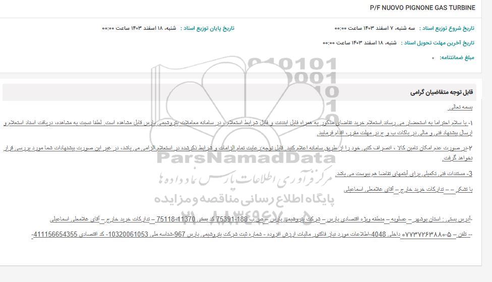 استعلام P/F NUOVO PIGNONE GAS TURBINE, استعلام P/F NUOVO PIGNONE GAS TURBINE
