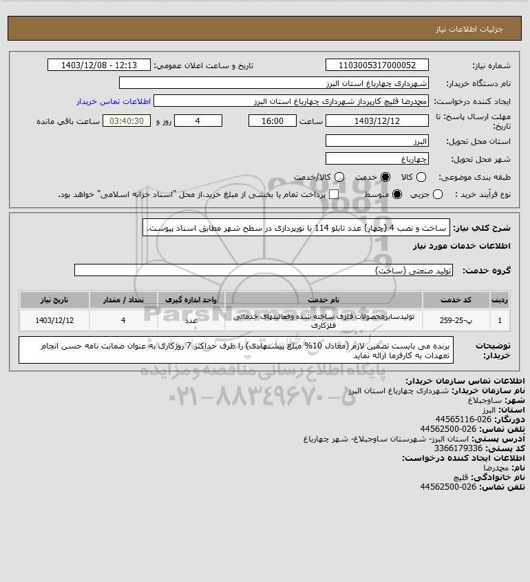 شرح کلی نیاز: ساخت و نصب 4 (چهار) عدد تابلو 114 با نورپردازی در سطح شهر مطابق اسناد پیوست.