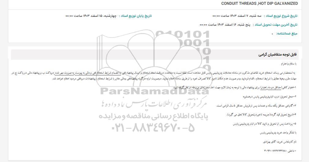 به استحضار می رساند استعلام خرید تقاضای مذکور در سامانه معاملات پتروشیمی پارس قابل مشاهده است. لطفا نسبت به مشاهده دریافت استاد استعلام و ارسال پیشنهاد فنی به انضمام شرایط استعلام فنی و مالی به پیوست به صورت مهر شده در پاکت به و پیشنهاد مالی در پاکت و در مهلت مقرر وعینا مطابق با شرایط استعلام ، اقدام فرمایید و در صورت عدم امکان تامین کالا انصراف خود را از طریق سامانه اعلام نمایید. در صورت ارایه هر گونه پیشنها دفتی و مالی مغایر با شرایط استعلام ، پیشنهادات دریافتی مردود اعلام خواهد شد.