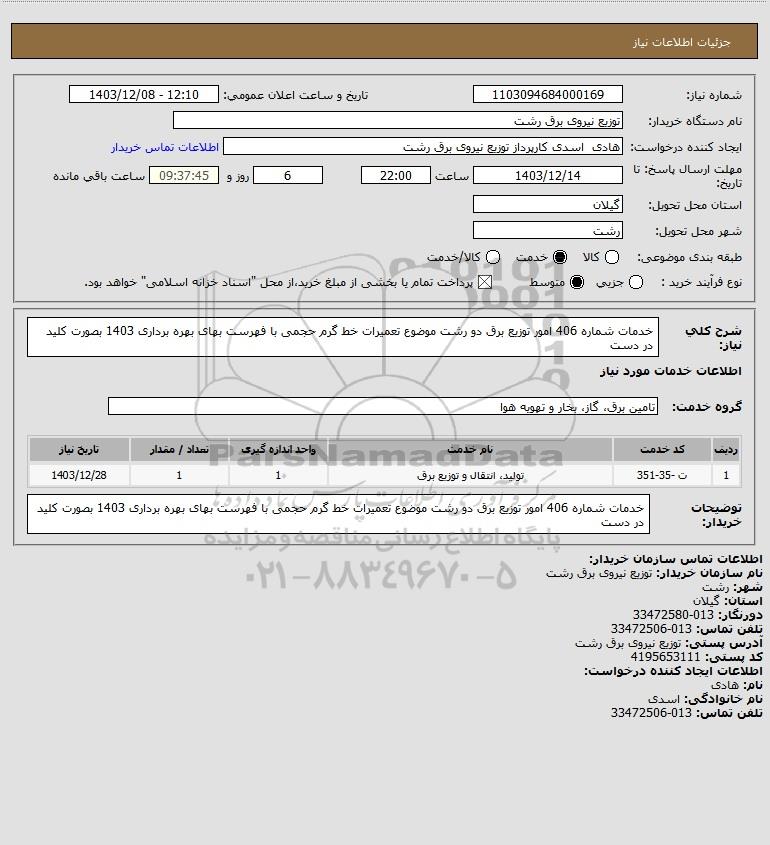 شرح کلی نیاز: خدمات شماره 406 امور توزیع برق دو رشت موضوع تعمیرات خط گرم حجمی با فهرست بهای بهره برداری 1403 بصورت کلید در دست