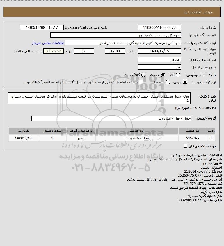 شرح کلی نیاز: موتور سوار مسلط به منطقه جهت توزیع مرسولات پستی شهرستان دیر قیمت پیشنهادی به ازای هر مرسوله پستی. شماره 1