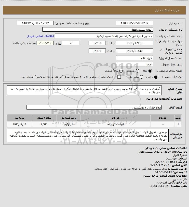 شرح کلی نیاز: گوشت سر دست گوساله بدون چربی تاریخ انقضاحداقل شش ماه هزینه بارگیری،حمل تا محل تحویل و تخلیه با تامین کننده می باشد