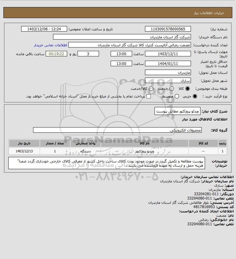 شرح کلی نیاز: ویدئو پروژکتور مطابق پیوست