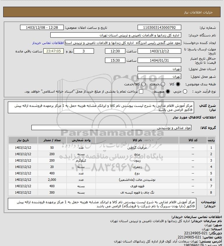 شرح کلی نیاز: مرکز آموزش اقلام غذایی به شرح لیست پیوستی نام کالا و ایرانکد مشابه هزینه حمل به 1 مرکز برعهده فروشنده ارائه پیش فاکتور الزامی می باشد