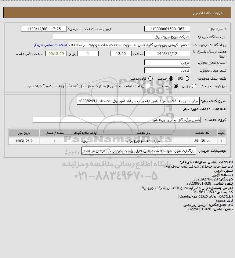 شرح کلی نیاز: برقرسانی به آقای اصغر قلیایی اراضی رحیم آباد امور برق تاکستان s03082441