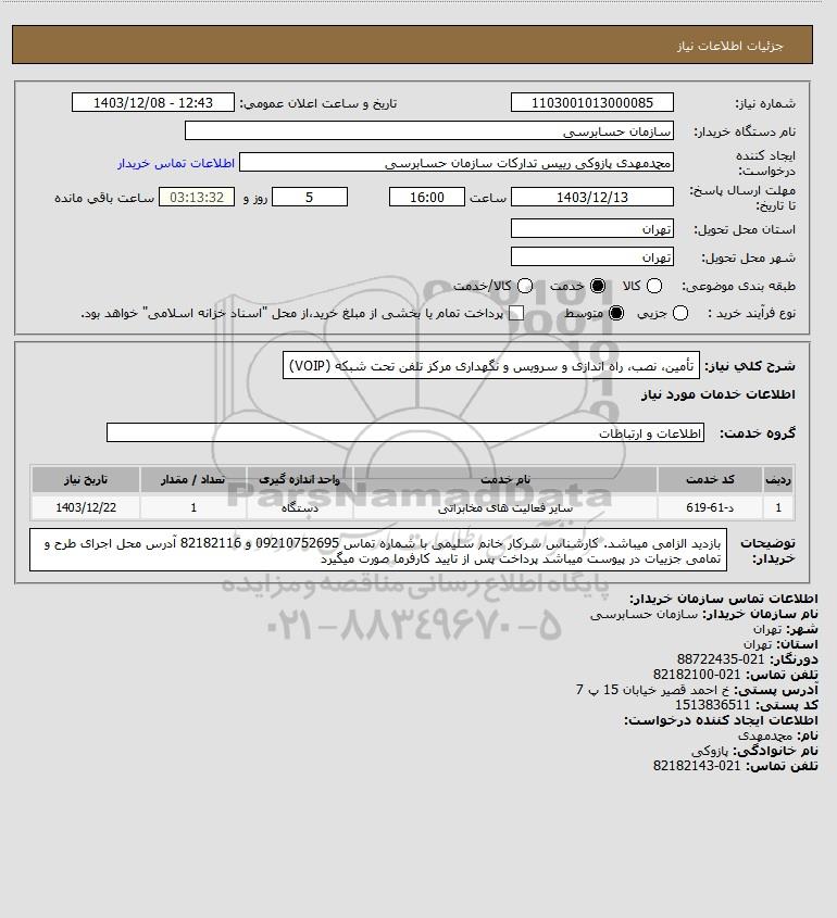 شرح کلی نیاز: تأمین، نصب، راه اندازی و سرویس و نگهداری مرکز تلفن تحت شبکه (VOIP)