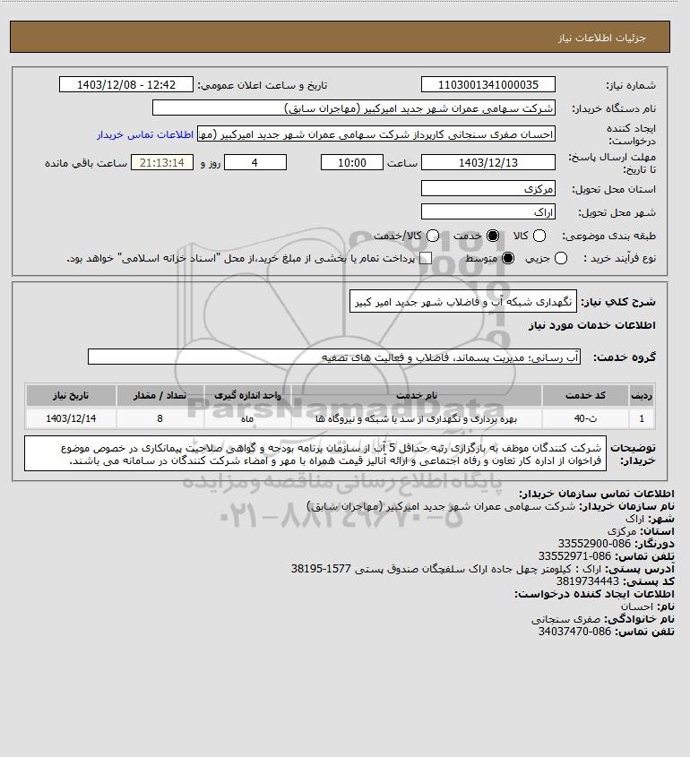 شرح کلی نیاز: نگهداری شبکه آب و فاضلاب شهر جدید امیر کبیر