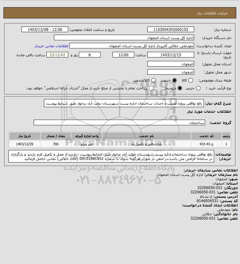 شرح کلی نیاز: رفع نواقص پروژه تخریب و احداث ساختمان اداره پست شهرستان دولت آباد برخوار طبق شرایط پیوست