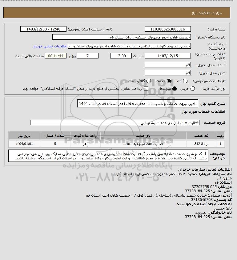 شرح کلی نیاز: تامین نیروی خدمات و تاسیسات جمعیت هلال احمر استان قم در سال 1404