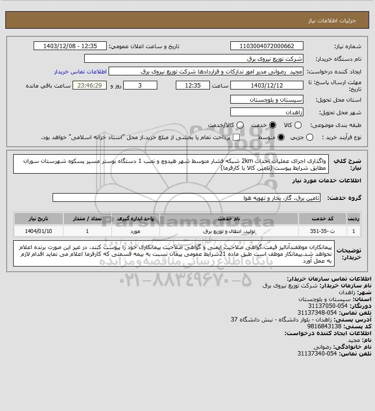 شرح کلی نیاز: واگذاری اجرای عملیات احداث 2km شبکه فشار متوسط شهر هیدوچ و نصب 1 دستگاه بوستر مسیر پسکوه شهرستان سوران مطابق شرایط پیوست (تامین کالا با کارفرما)