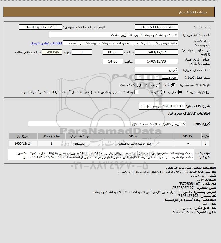 | 1 | -- | لیبل پرینتر رومیزی صنعتی | دستگاه | 1 | 1403/12/16 |