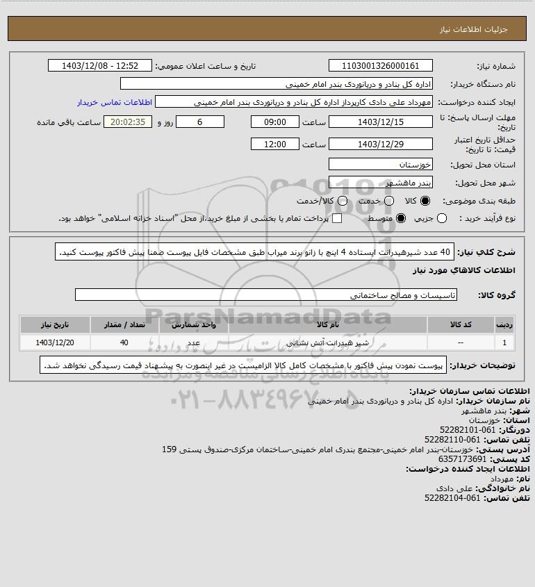 | 1 | -- | شیر هیدرانت آتش نشانی | عدد | 40 | 1403/12/20 |