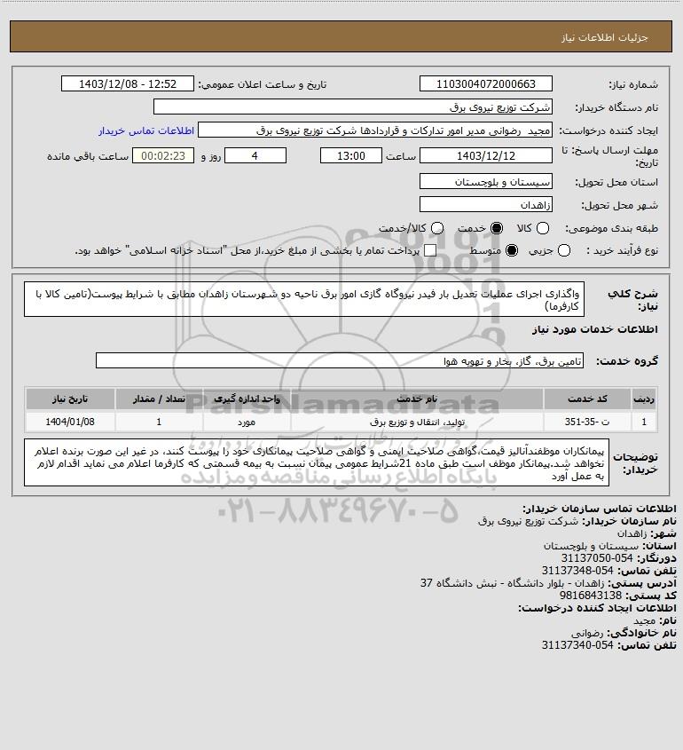 شرح کلی نیاز: واگذاری اجرای عملیات تعدیل بار فیدر نیروگاه گازی امور برق ناحیه دو شهرستان زاهدان مطابق با شرایط پیوست(تامین کالا با کارفرما)