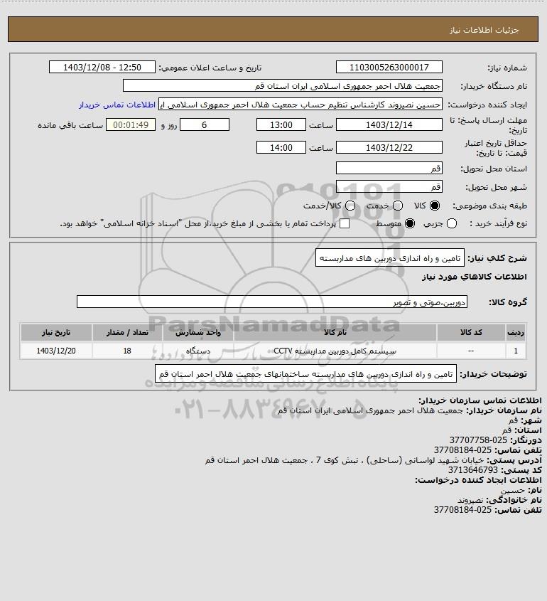 توضیحات خریدار:تامین و راه اندازی دوربین های مداربسته ساختمانهای جمعیت هلال احمر استان قم