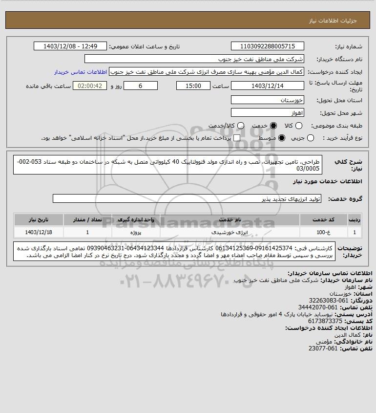 استعلام بها و موضوع استعلام استعلام طراحی، تامین تجهیزات، نصب و راه اندازی مولد فتوولتاییک 40 کیلوواتی متصل به شبکه در ساختمان دو طبقه ستاد 053-002-03/0005 به اطلاع کلیه شرکتها و افراد متخصص واجد شرایط میرساند، آگهی گذار در نظر دارد از طریق استعلام بها، نسبت به انتخاب و دریافت پیشنهادات اقدام نماید. این استعلام با کد آگهی ثبت شده در سامانه خبرگزاری پارس نماد : 8734159 منتشر شده است. مشخصات استعلام : تاریخ شروع استعلام: 1403/12/08 آخرین مهلت ارسال پیشنهاد قیمت : 1403/12/14 و محل اجرای پروژه : استان خوزستان میباشد. استعلام قیمت مورد درخواست : استعلام طراحی، تامین تجهیزات، نصب و راه اندازی مولد فتوولتاییک 40 کیلوواتی متصل به شبکه در ساختمان دو طبقه ستاد 053-002-03/0005 با دستهبندیهای تخصصی و گروه های مرتبط : پیمانکاری برق و الکترونیک, مشاوره برق, تجهیزات و خدمات انرژی خورشیدی, استعلام اطلاع رسانی میگردد.