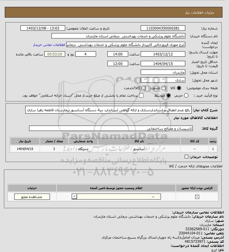 شرح کلی نیاز: رفع عدم انطباق و استانداردسازی و ارائه گواهی استاندارد سه دستگاه آسانسور بیمارستان فاطمه زهرا ساری
