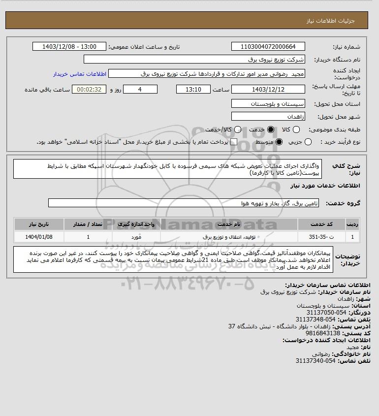 شرح کلی نیاز: واگذاری اجرای عملیات تعویض شبکه های سیمی فرسوده با کابل خودنگهدار شهرستان اسپکه مطابق با شرایط پیوست(تامین کالا با کارفرما)