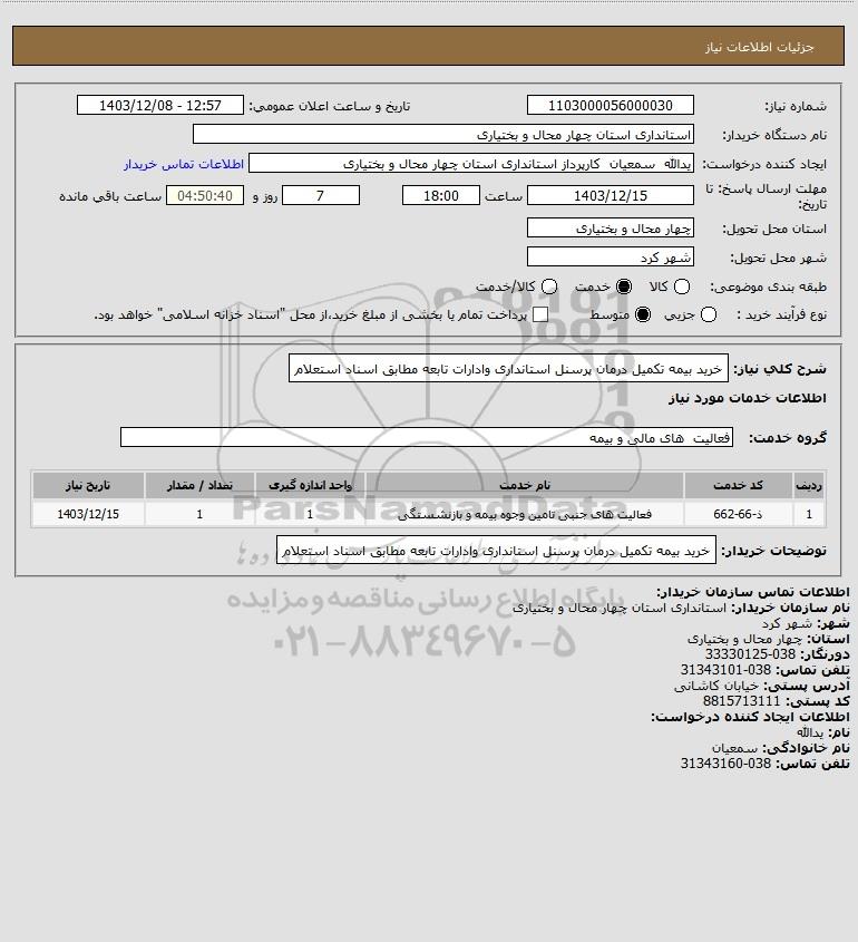 شرح کلی نیاز: خرید بیمه تکمیل درمان پرسنل استانداری وادارات تابعه مطابق اسناد استعلام