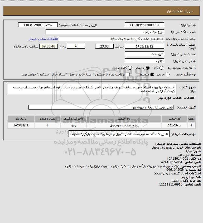 استعلام استعلام بها پروژه اصلاح و بهینه سازی شهری چغامیش تامین کنندگان محترم براساس فرم استعلام بها و مستندات پیوست قیمت گذاری را انجام دهند., استعلام استعلام بها پروژه اصلاح و بهینه سازی شهری چغامیش تامین کنندگان محترم براساس فرم استعلام بها و مستندات پیوست قیمت گذاری را انجام دهند.