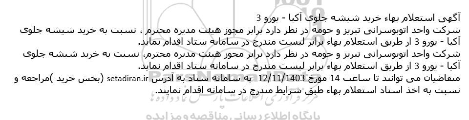 آگهی استعلام بهاء خرید شیشه جلوی آکیا - یورو 3 ؟