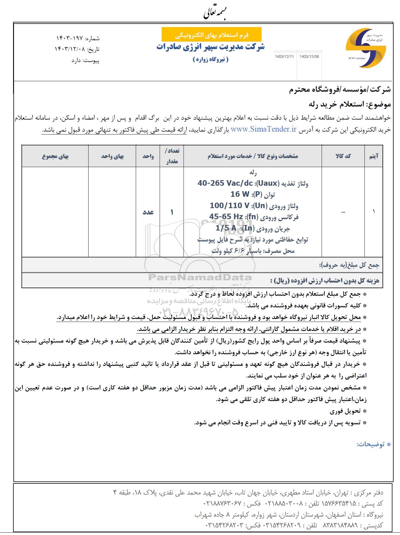 استعلام بها و موضوع استعلام استعلام رله به اطلاع کلیه شرکتها و افراد متخصص واجد شرایط میرساند، آگهی گذار در نظر دارد از طریق استعلام بها، نسبت به انتخاب و دریافت پیشنهادات اقدام نماید. این استعلام با کد آگهی ثبت شده در سامانه خبرگزاری پارس نماد : 8734451 منتشر شده است. مشخصات استعلام : تاریخ شروع استعلام: 1403/12/08 آخرین مهلت ارسال پیشنهاد قیمت : 1403/12/11 و محل اجرای پروژه : استان اصفهان میباشد. استعلام قیمت مورد درخواست : استعلام رله با دستهبندیهای تخصصی و گروه های مرتبط : ابزار دقیق, نیروگاه, تجهیزات برق و الکترونیک, استعلام اطلاع رسانی میگردد.