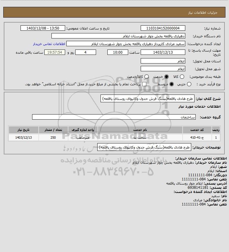استعلام بها و موضوع استعلام استعلام طرح هادی پاقلعه(سنگ فرش جدول وکانیوای روستای پاقلعه) به اطلاع کلیه شرکتها و افراد متخصص واجد شرایط میرساند، آگهی گذار در نظر دارد از طریق استعلام بها، نسبت به انتخاب و دریافت پیشنهادات اقدام نماید. این استعلام با کد آگهی ثبت شده در سامانه خبرگزاری پارس نماد : 8734463 منتشر شده است. مشخصات استعلام : تاریخ شروع استعلام: 1403/12/08 آخرین مهلت ارسال پیشنهاد قیمت : 1403/12/13 و محل اجرای پروژه : استان ایلام میباشد. استعلام قیمت مورد درخواست : استعلام طرح هادی پاقلعه(سنگ فرش جدول وکانیوای روستای پاقلعه) با دستهبندیهای تخصصی و گروه های مرتبط : انواع کفپوش, محوطه سازی ، جدول گذاری و پیاده رو سازی, راهسازی, ساختمان, استعلام اطلاع رسانی میگردد.