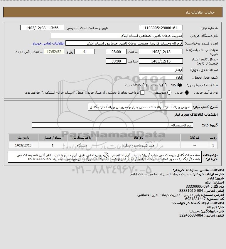 شرح کلی نیاز: تعویض و راه اندازی لوله های مسی چیلر و سرویس و راه اندازی کامل