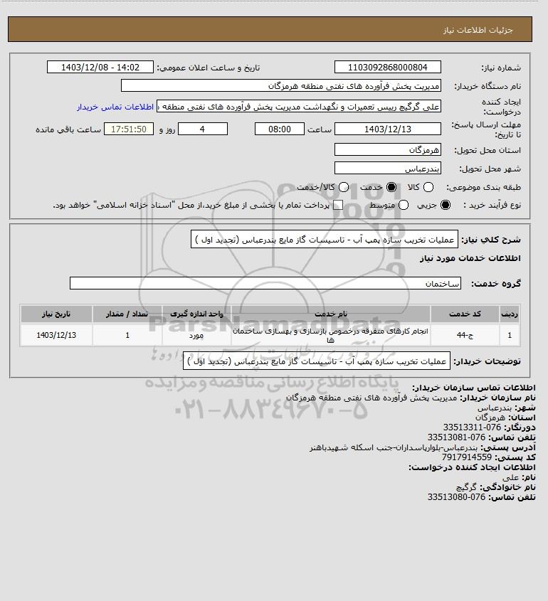 شرح کلی نیاز: عملیات تخریب سازه پمپ آب - تاسیسات گاز مایع بندرعباس (تجدید اول )