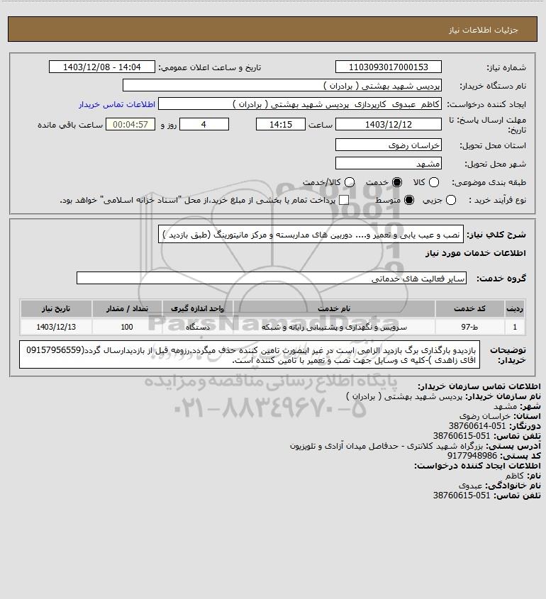 استعلام نصب و عیب یابی و تعمیر و.... دوربین های مداربسته و مرکز مانیتورینگ (طبق بازدید ), استعلام نصب و عیب یابی و تعمیر و.... دوربین های مداربسته و مرکز مانیتورینگ (طبق بازدید )