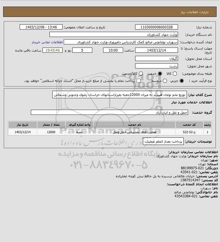 شرح کلی نیاز: توزیع تخم نوغان هیبرید به میزان 12000جعبه بغیرازاستانهای خراسان رضوی وجنوبی وشمالی