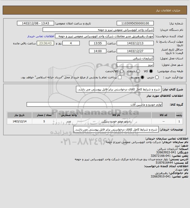 استعلام بها و موضوع استعلام استعلام شرح و شرایط کامل کالای درخواستی برابر فایل پیوستی می باشد. به اطلاع کلیه شرکتها و افراد متخصص واجد شرایط میرساند، آگهی گذار در نظر دارد از طریق استعلام بها، نسبت به انتخاب و دریافت پیشنهادات اقدام نماید. این استعلام با کد آگهی ثبت شده در سامانه خبرگزاری پارس نماد : 8734777 منتشر شده است. مشخصات استعلام : تاریخ شروع استعلام: 1403/12/08 آخرین مهلت ارسال پیشنهاد قیمت : 1403/12/13 و محل اجرای پروژه : استان آذربایجان شرقی میباشد. استعلام قیمت مورد درخواست : استعلام شرح و شرایط کامل کالای درخواستی برابر فایل پیوستی می باشد. با دستهبندیهای تخصصی و گروه های مرتبط : رادیاتور, صنایع حرارتی و برودتی, تامین،تعمیرات و اجاره خودروهای سنگین و نیمه سنگین, قطعات خودرو, استعلام اطلاع رسانی میگردد.